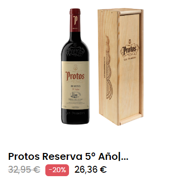 Disfrute del lujo de Protos Reserva 2017, elegantemente empaquetado en una hermosa caja de madera, ahora disponible en Bodegas Protos Tienda a un precio inmejorable. Con un precio original de 32,95 €, puedes comprar esta hermosa botella por solo 26,36 €: ¡un fantástico descuento del 20 % que no querrás perderte! Disfrute de una entrega inmediata en un plazo de 24 a 72 horas hábiles, lo que garantiza que recibirá esta magnífica cosecha de inmediato. ¡No olvide utilizar su código de descuento exclusivo de Bodegas Protos Tienda al finalizar la compra para ahorrar aún más!