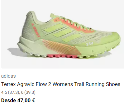 Si eres una mujer aventurera a la que le encantan los todoterreno, Terrex Agravic Flow 2 Womens Trail Running Shoes es el compañero perfecto para tus aventuras todoterreno. Por sólo 47,00 €, estas zapatillas de trail running combinan rendimiento, comodidad y durabilidad, lo que las convierte en una gran inversión para tus actividades al aire libre. La parte superior de malla diseñada del calzado garantiza una excelente transpirabilidad, manteniendo los pies frescos y cómodos incluso durante carreras intensas.